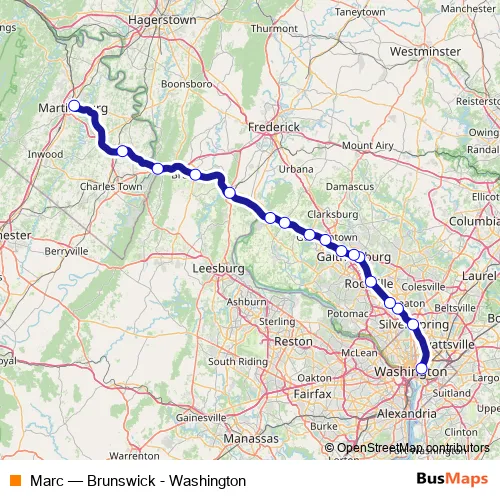 The first stop of the Marc rail route is Union Station Marc Washington and the last stop is Martinsburg W VA Marc. Marc (Brunswick - Washington) is operational during on weekdays.
