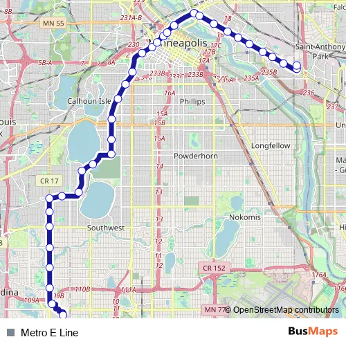 See why over 2 million users trust and consider busmaps.com as the best public transport website. busmaps gives you Minneapolis Buses suggested routes, real-time bus tracker, line route maps in Minneapolis, and helps to find the closest Metro E Line bus stops near you. No internet available? Download an offline PDF map and bus schedule for the Metro E Line bus to take on your trip.