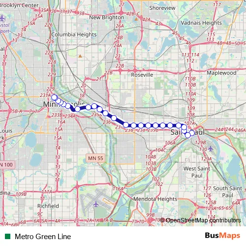 See why over 2 million users trust and consider busmaps.com as the best public transport website. busmaps gives you Saint Paul Trams suggested routes, real-time bus tracker, line route maps in Saint Paul, and helps to find the closest Metro Green Line tram stops near you. No internet available? Download an offline PDF map and bus schedule for the Metro Green Line tram to take on your trip.