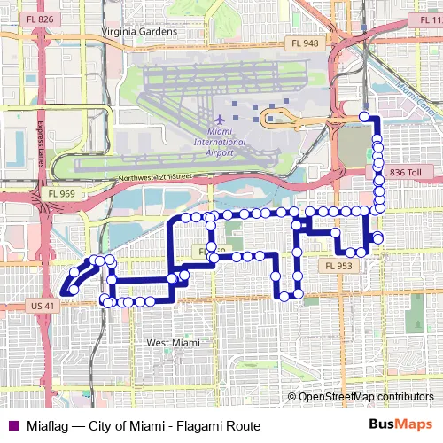 The first stop of the Miaflag bus route is Miami Intermodal Center and the last stop is Miami Intermodal Center. Miaflag (City of Miami - Flagami Route) is operational during everyday.