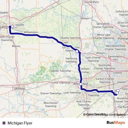 The first stop of the Michigan Flyer bus route is DTW Evans Terminal and the last stop is East Lansing Marriott. Michigan Flyer (Michigan Flyer) is operational during everyday.