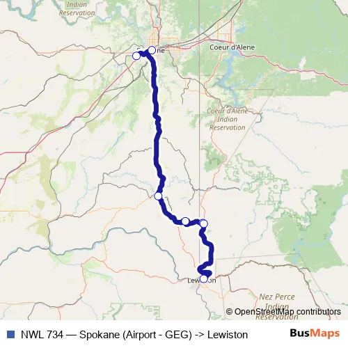 The first stop of the NWL 734 bus route is Spokane (Airport - Geg) and the last stop is Lewiston. NWL 734 (Spokane (Airport - GEG) -> Lewiston) is operational during everyday.