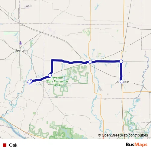 The first stop of the Oak bus route is Steeleville City Hall (Steeleville) and the last stop is Du Quoin Bus Shelter (Du Quoin). Oak is operational during on weekdays.