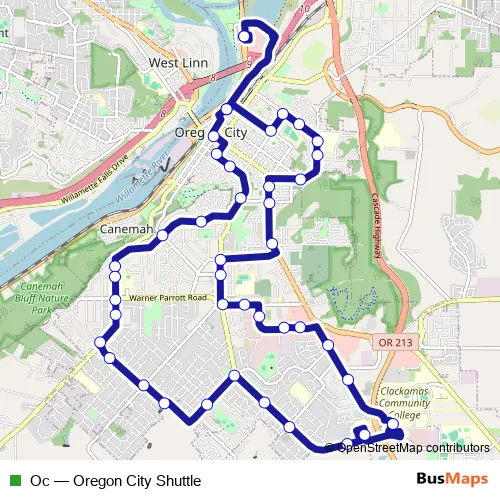 The first stop of the Oc bus route is Mcloughlin & Oregon City Shopping Center and the last stop is Mcloughlin & Oregon City Shopping Center. Oc (Oregon City Shuttle) is operational during on weekdays.