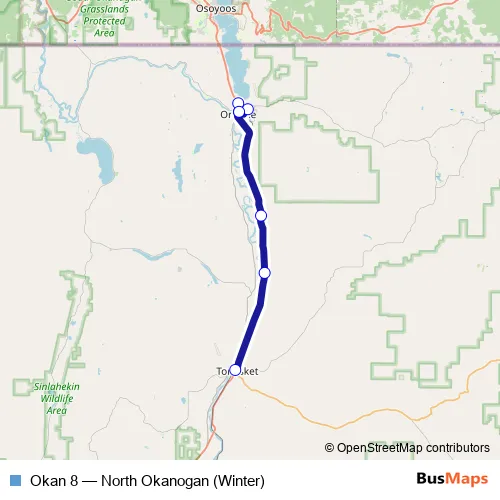 The first stop of the Okan 8 bus route is Chevron Oroville and the last stop is Tonasket Pud. Okan 8 (North Okanogan (Winter)) is operational during everyday.