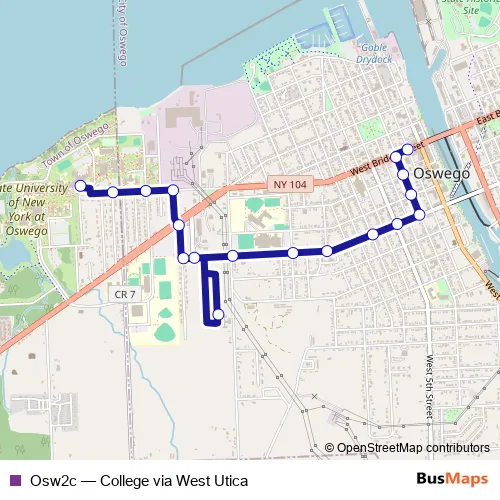 The first stop of the Osw2c bus route is W Bridge St & W 2nd St and the last stop is Suny Oswego Campus Center. Osw2c (College via West Utica) is operational during everyday.