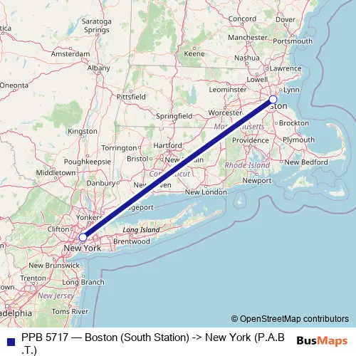 The first stop of the PPB 5717 bus route is Boston (South Station) and the last stop is New York (P.A.B.T.). PPB 5717 (Boston (South Station) -> New York (P.A.B.T.)) is operational during on weekends.