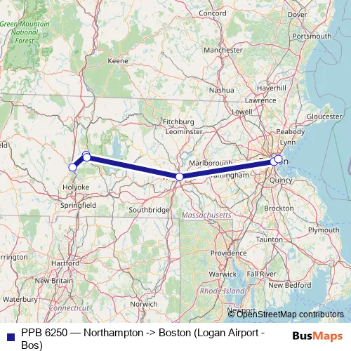 The first stop of the PPB 6250 bus route is Northampton and the last stop is Boston (Logan Airport). PPB 6250 (Northampton -> Boston (Logan Airport - Bos)) is operational during everyday.