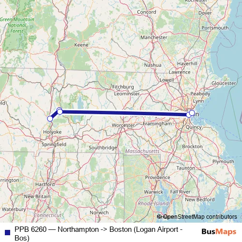 The first stop of the PPB 6260 bus route is Northampton and the last stop is Boston (Logan Airport). PPB 6260 (Northampton -> Boston (Logan Airport - Bos)) is operational during everyday.