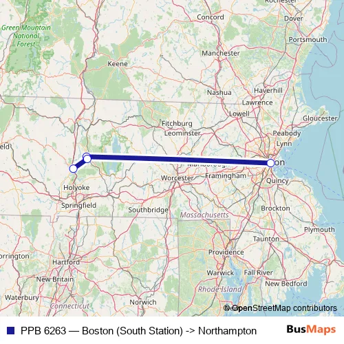 The first stop of the PPB 6263 bus route is Boston (South Station) and the last stop is Northampton. PPB 6263 (Boston (South Station) -> Northampton) is operational during everyday.