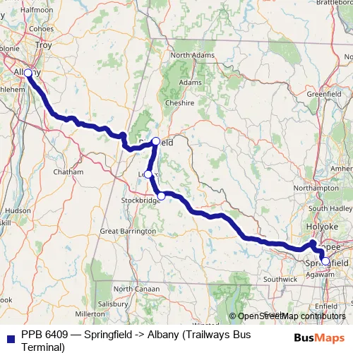 The first stop of the PPB 6409 bus route is Springfield and the last stop is Albany (Trailways Bus Terminal). PPB 6409 (Springfield -> Albany (Trailways Bus Terminal)) is operational during everyday.