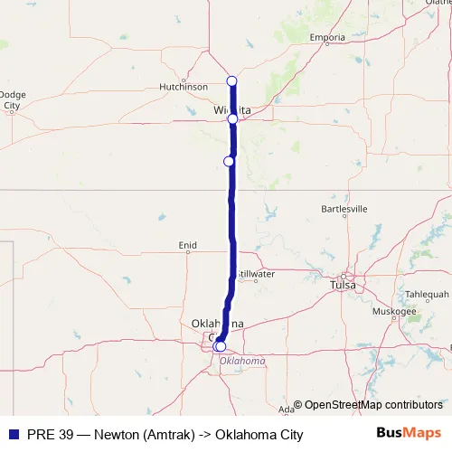 The first stop of the PRE 39 bus route is Newton (Amtrak) and the last stop is Oklahoma City. PRE 39 (Newton (Amtrak) -> Oklahoma City) is operational during everyday.