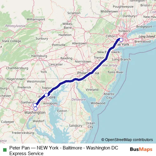 The first stop of the Peter Pan bus route is Union Station, Washington, Dc and the last stop is Port Authority Bus Terminal, New York, Ny. Peter Pan (NEW York - Baltimore - Washington DC Express Service) is operational during everyday.