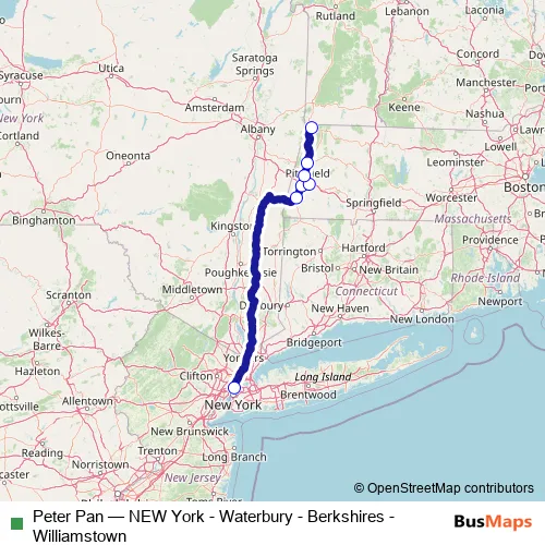 The first stop of the Peter Pan bus route is Port Authority Bus Terminal, New York, Ny and the last stop is Williams Inn, Williamstown, Ma. Peter Pan (NEW York - Waterbury - Berkshires - Williamstown) is operational during on weekends.