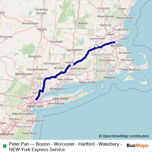 The first stop of the Peter Pan bus route is Port Authority Bus Terminal, New York, Ny and the last stop is South Station, Boston, Ma. Peter Pan (Boston - Worcester - Hartford - Waterbury - NEW York Express Service) is operational during everyday.