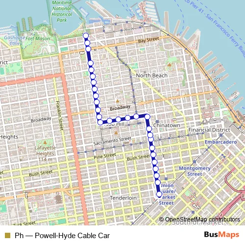 The first stop of the Ph tram route is Powell St & Market St and the last stop is Hyde St & Beach St. Ph (Powell-Hyde Cable Car) is operational during everyday.