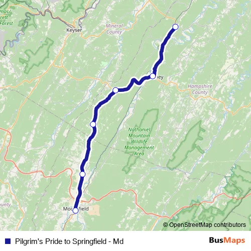 The first stop of the Pilgrim's Pride to Springfield - Md bus route is Moorefield Pilgrim's Pride and the last stop is Springfield, call (304) 257-1414 for a 3/4 mile deviation. Pilgrim's Pride to Springfield - Md (Pilgrim's Pride to Springfield - Md) is operational during everyday.