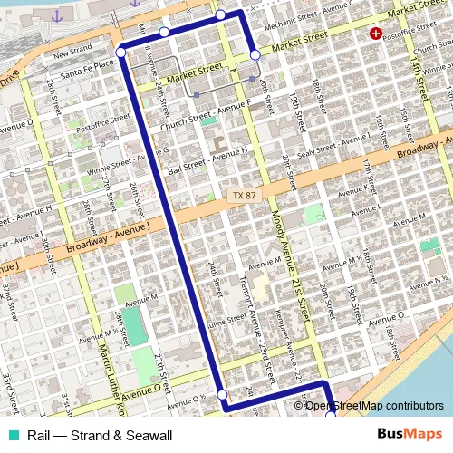 The first stop of the Rail tram route is 20th St & Market St (Old Terminal) and the last stop is Seawall Blvd & Moody Ave - 21st St. Rail (Strand & Seawall) is operational during on weekends.