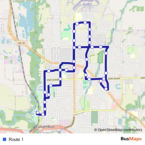 The first stop of the Route 1 bus route is Columbus Transit Depot and the last stop is Columbus Transit Depot. Route 1 is operational during everyday.