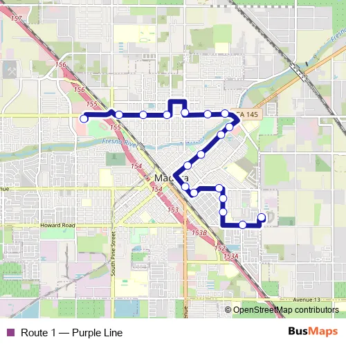 The first stop of the Route 1 bus route is Madera County Department of Corrections and the last stop is Walgreens at Cleveland Avenue. Route 1 (Purple Line) is operational during everyday.