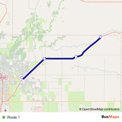 The first stop of the Route 1 bus route is Postal Service, Ramah (call 719 6334677 for pick-up) and the last stop is King Soopers-Falcon. Route 1 is operational during everyday.