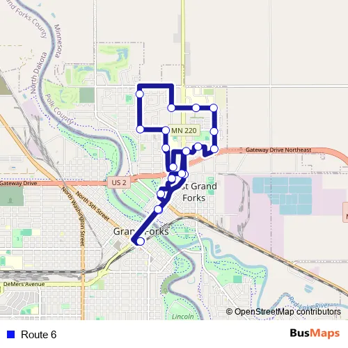 See why over 2 million users trust and consider busmaps.com as the best public transport website. busmaps gives you Grand Forks Buses suggested routes, real-time bus tracker, line route maps in Grand Forks, and helps to find the closest Route 6 bus stops near you. No internet available? Download an offline PDF map and bus schedule for the Route 6 bus to take on your trip.