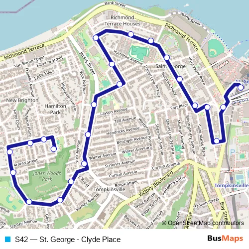 The first stop of the S42 bus route is Saint George Ferry/Ramp A S61 & S91 and the last stop is Clyde PL/Arnold St. S42 (St. George - Clyde Place) is operational during on weekdays.