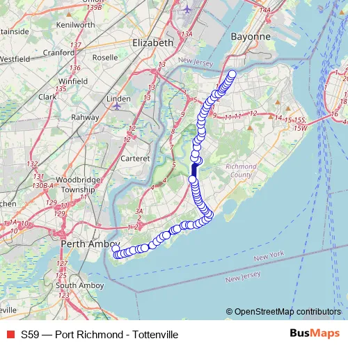 The first stop of the S59 bus route is Main ST/Amboy Rd and the last stop is Port Richmond AV/Richmond Terr. S59 (Port Richmond - Tottenville) is operational during everyday.