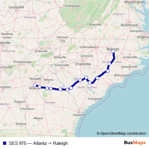 The first stop of the SES 975 bus route is Atlanta and the last stop is Raleigh. SES 975 (Atlanta -> Raleigh) is operational during everyday.