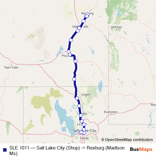 The first stop of the SLE 1011 bus route is Salt Lake City (Shop) and the last stop is Rexburg (Madison MS - Ofy). SLE 1011 (Salt Lake City (Shop) -> Rexburg (Madison Ms)) is operational during everyday.