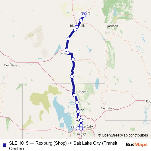 The first stop of the SLE 1015 bus route is Rexburg (Shop) and the last stop is Salt Lake City (Transit Center). SLE 1015 (Rexburg (Shop) -> Salt Lake City (Transit Center)) is operational during everyday.