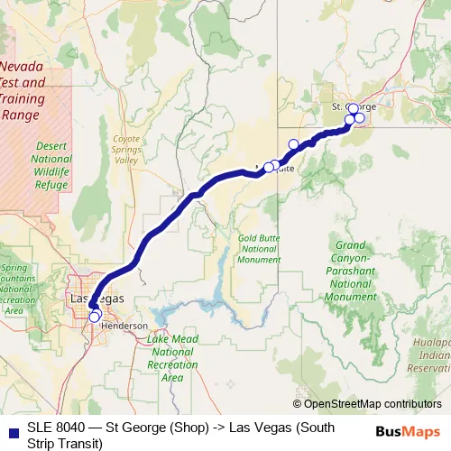 The first stop of the SLE 8040 bus route is Saint George (Shop) and the last stop is Las Vegas (South Strip Transit). SLE 8040 (St George (Shop) -> Las Vegas (South Strip Transit)) is operational during everyday.