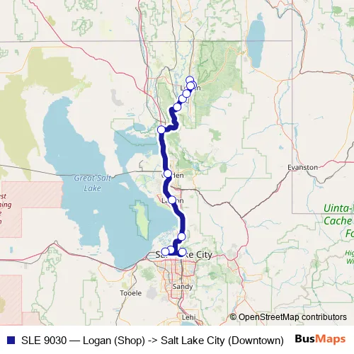 The first stop of the SLE 9030 bus route is Logan (Shop) and the last stop is Salt Lake City (Downtown). SLE 9030 (Logan (Shop) -> Salt Lake City (Downtown)) is operational during everyday.