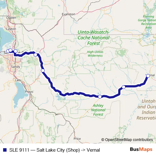 The first stop of the SLE 9111 bus route is Salt Lake City (Shop) and the last stop is Vernal. SLE 9111 (Salt Lake City (Shop) -> Vernal) is operational during everyday.