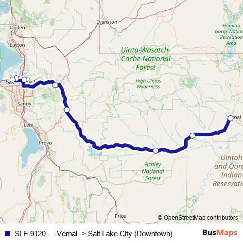 The first stop of the SLE 9120 bus route is Vernal and the last stop is Salt Lake City (Downtown). SLE 9120 (Vernal -> Salt Lake City (Downtown)) is operational during everyday.