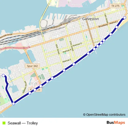 The first stop of the Seawall bus route is Hope Blvd & Moody Gardens and the last stop is Stewart Beach. Seawall (Trolley) is operational during on weekends.