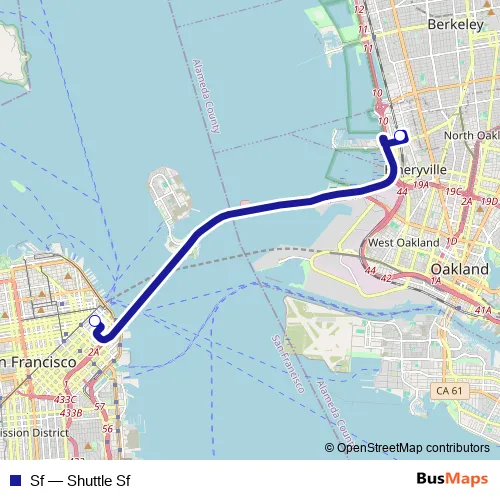 The first stop of the Sf bus route is Emeryville and the last stop is San Francisco - Transbay Terminal. Sf (Shuttle Sf) is operational during everyday.