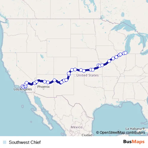 The first stop of the Southwest Chief rail route is Los Angeles and the last stop is Chicago Union Station. Southwest Chief (Southwest Chief) is operational during everyday.