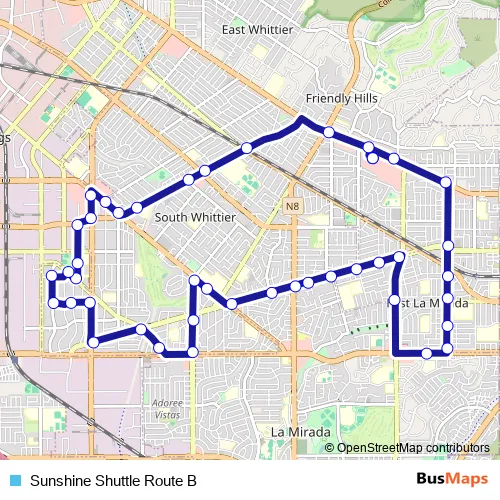See why over 2 million users trust and consider busmaps.com as the best public transport website. busmaps gives you South Whittier Buses suggested routes, real-time bus tracker, line route maps in South Whittier, and helps to find the closest Sunshine Shuttle Route B bus stops near you. No internet available? Download an offline PDF map and bus schedule for the Sunshine Shuttle Route B bus to take on your trip.