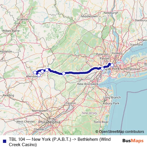 The first stop of the TBL 104 bus route is New York (P.A.B.T.) and the last stop is Bethlehem (Wind Creek Casino). TBL 104 (New York (P.A.B.T.) -> Bethlehem (Wind Creek Casino)) is operational during on weekdays.