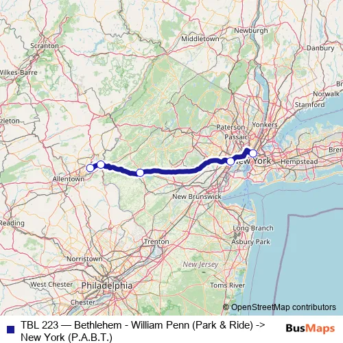 Click here to view the nearest TBL 223 - Bethlehem - William Penn (Park & Ride) -> New York (P.A.B.T.) bus stop.
