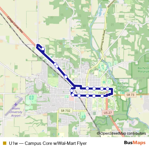 The first stop of the U1w bus route is Farmer School and the last stop is Miami Station B. U1w (Campus Core w/Wal-Mart Flyer) is operational during on weekdays.