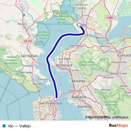 The first stop of the Vjo ferry route is San Francisco Ferry Building Gate E and the last stop is Mare Island Ferry Terminal. Vjo (Vallejo) is operational during everyday.