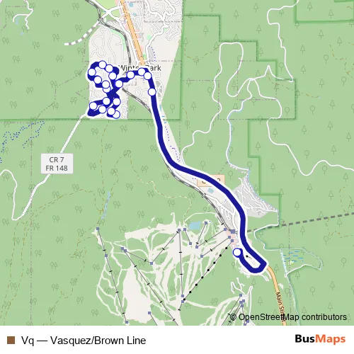 The first stop of the Vq bus route is Winter Park Resort and the last stop is Winter Park Resort. Vq (Vasquez/Brown Line) is operational during everyday.