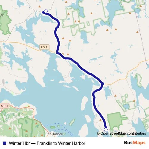 The first stop of the Winter Hbr bus route is Winter Harbor and the last stop is Franklin. Winter Hbr (Franklin to Winter Harbor) is operational during on weekdays.