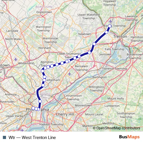 The first stop of the Wtr rail route is West Trenton and the last stop is Gray 30th St Station. Wtr (West Trenton Line) is operational during everyday.