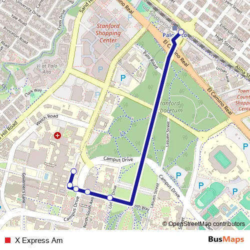The first stop of the X Express Am bus route is University Circle @ Caltrain Platform and the last stop is On Quarry Extension Across From Medical Center. X Express Am is operational during on weekdays.