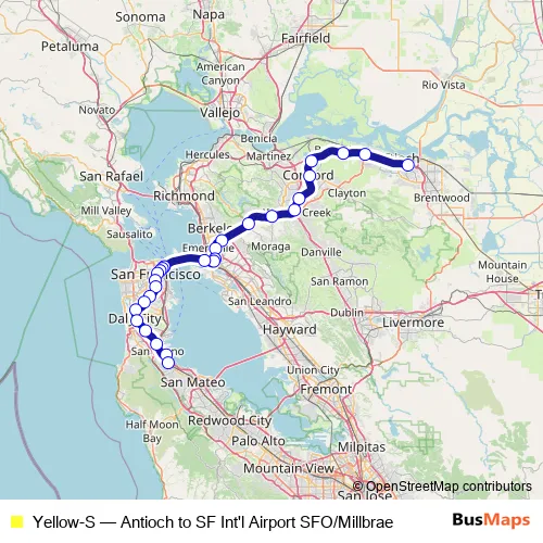 The first stop of the Yellow-S metro route is Antioch and the last stop is Millbrae (Caltrain Transfer Platform). Yellow-S (Antioch to SF Int'l Airport SFO/Millbrae) is operational during everyday.