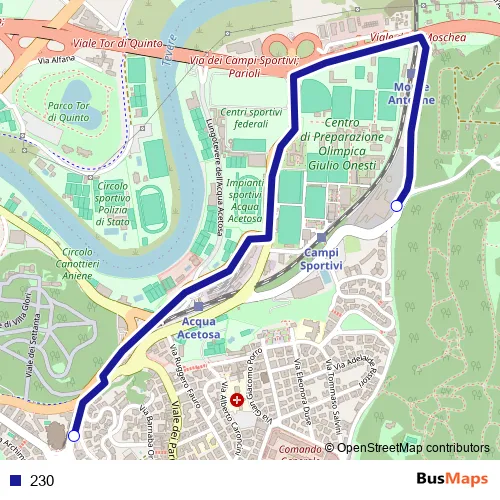 The first stop of the 230 bus route is Sacro Cuore DI Maria/Euclide and the last stop is Moschea/Forte Antenne. 230 is operational during everyday.
