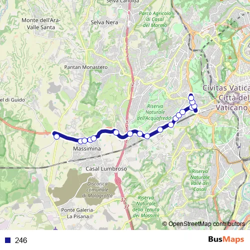 The first stop of the 246 bus route is Malagrotta and the last stop is Cornelia (Ma). 246 is operational during everyday.